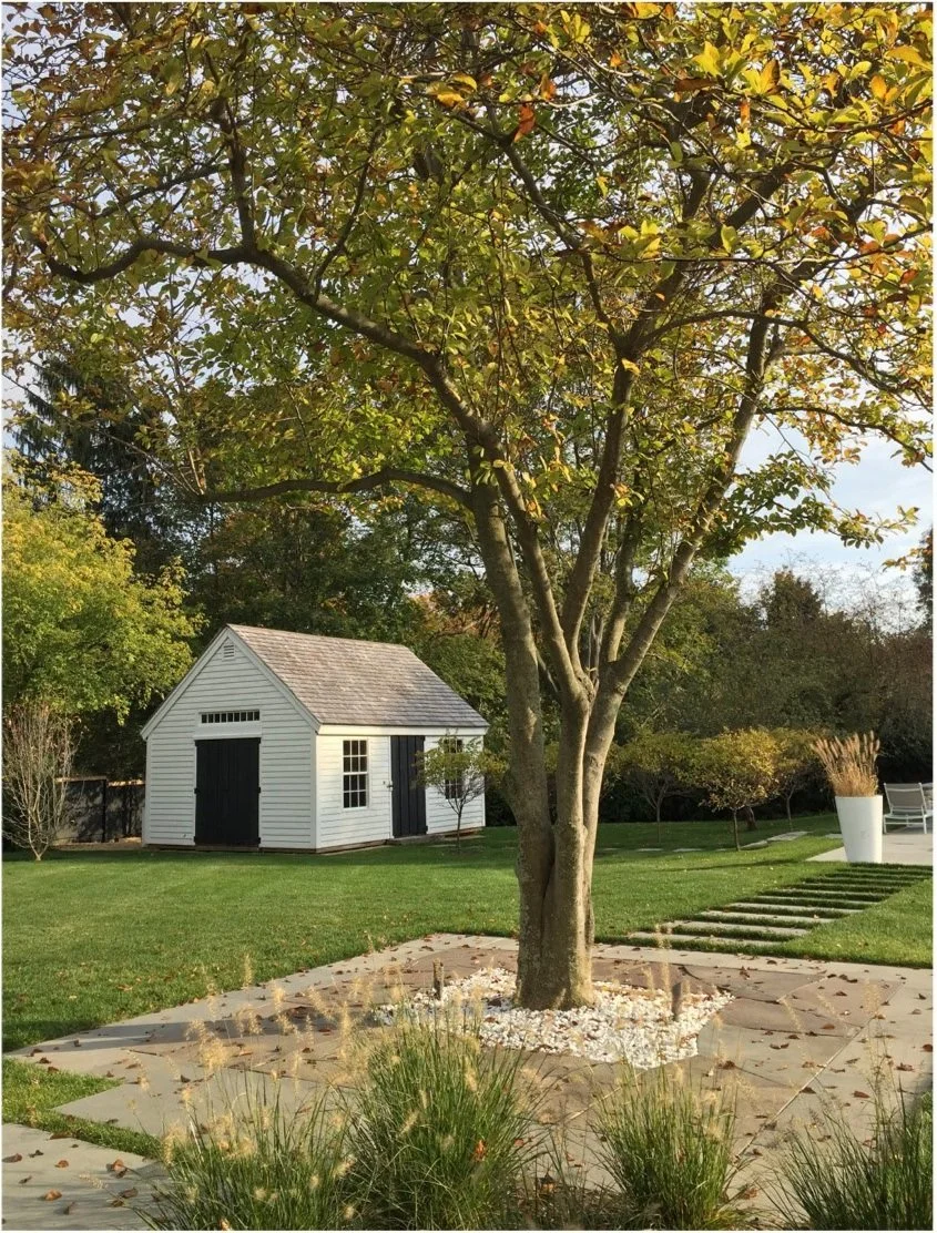 A contemporary landscape design complements a residence set in the historic village center of a South Shore town. Villagefield maintains clean lines and a minimalistic approach to bring together several outdoor living elements. New trees were added to the landscape as a sculptural component, framing and containing views within the space.